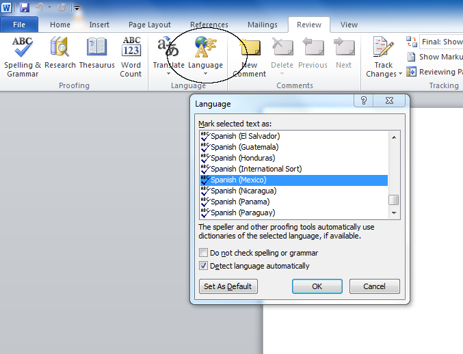 If you already have written some in Spanish before setting the language, hit ctrl a or cmd a on a Mac to select all, and then set the language.